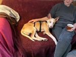 Der junge Podenco-Rüde Tapi lebt seit kurzer Zeit auf seiner Pflegestelle und hat sich dort bereits als ganz besonderer Hund gezeigt. Nach der ersten Nacht, in der er sich erst einmal von den vielen Eindrücken erholen musste, fand er schnell Ruhe und Sicherheit und schlief entspannt bis zum Morgen durch.